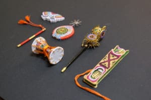 舞楽を題材に中田さんがつくられた帯留めや小物。非常に細密に着色されている。