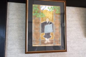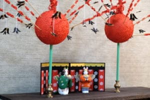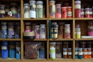 仕事部屋の絵具棚にも小さなお水取り練行衆の人形が!中田さんの奈良愛の深さを感じる