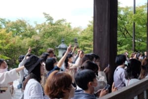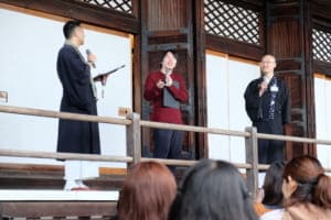 当日は、大殿に現れた人気YouTuber・こうちゃんと、永観堂のお坊さんたちが出すクイズを、たくさんの人たちが楽しむ姿が見られました。インタビューは全ステージ終了後に実施。寺フェスのプロデューサーを担ったお坊さん・川瀬亮俊さんと一緒に、今回のイベントの感想や歴史を紐解く面白さをお話しいただきました。