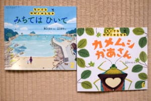 福音館書店「ちいさなかがくのとも」シリーズ。『カメムシかあさん』(山口てつじ作)、『みちてはひいて』(溝口たまみ作、山口哲司絵)