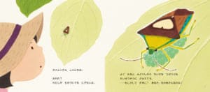 山口氏:『かめむしかあさん』は僕が企画しました。描いたのは「エサキモンツキノカメムシ」というカメムシ界のアイドル。背中にハートマークがあってめちゃくちゃかわいいんですよ。このカメムシは、梅田のオフィスビルの下にある街路樹、ハナミズキで偶然見つけて取材しました。昼休みにOLさんがお弁当を食べているような場所で、「なんかいるような気がする」と思ったら本当にいたので、「おった!」と大きな声を出して周囲の人をびっくりさせてしまいました(笑)。ハナミズキの葉の上で、お母さんカメムシが生まれた卵を守っていたんです。