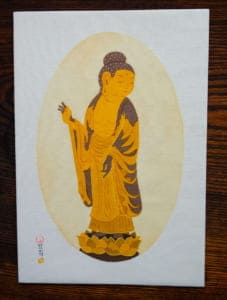 絵はがきは五枚一組。布に手描きする山口さんの暖かい作風で、永観堂の四季とご本尊・みかえり阿弥陀さまが描かれています。手触りのよい風合いのある紙に印刷されていて、とても美しい仕上がりです。