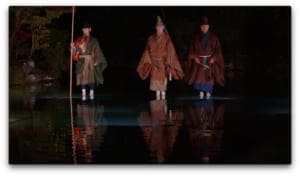 『法然上人と室津の遊女』は、法然上人のエピソードに材を取った創作舞台。永観堂境内の中心にある放生池の上で、能楽師安田登の一座『ノボルーザ』と西山禅林寺派全国青年会のコラボレーションにより上演・奉納されました。また、雨天の日には大殿にて、法然上人像が見守るなかで演じられました。
